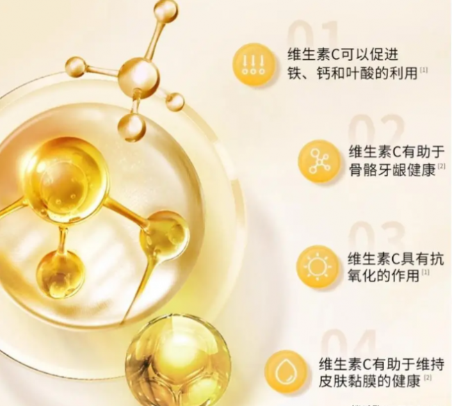 100%采用L-抗坏血酸,人体可直接吸收利用,无无效成分干扰;复配柑橘生物类黄酮、维生素E、锌黄金组合,形成“补充-吸收-协同-养护”四层作用,效果更全面。